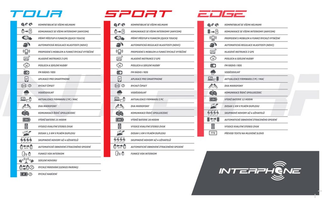 - kompatibilita: všechny běžné přilby na trhu/ všechny smartphony s Bluetooth technologií/ GPS navigace s Bluetooth® technologie a HF profilem/ intercomy jiných značek/ všemi staršími modely Interphone