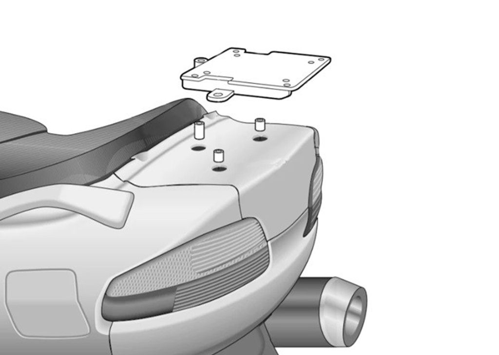 K upevnění vrchního kufru SHAD na motorku stačí namontovat tuto montážní sadu, plotna je vždy součástí kufru (kromě kufrů TR48/TR37).