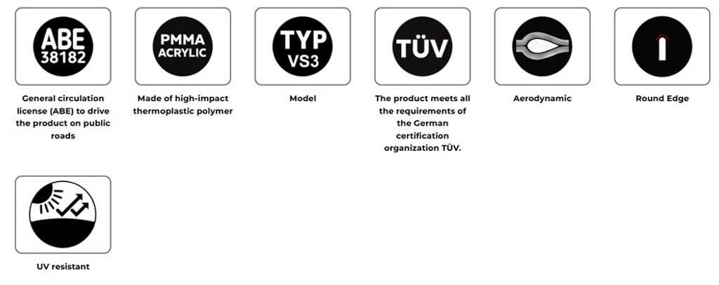 Jejich kompaktní rozměry, mírně menší než originální plexi (pokud je instalováno), zajišťují výraznou ochranu a pocit komfortu, stejně jako sportovní vzhled, aniž by omezovaly výhled jezdce.