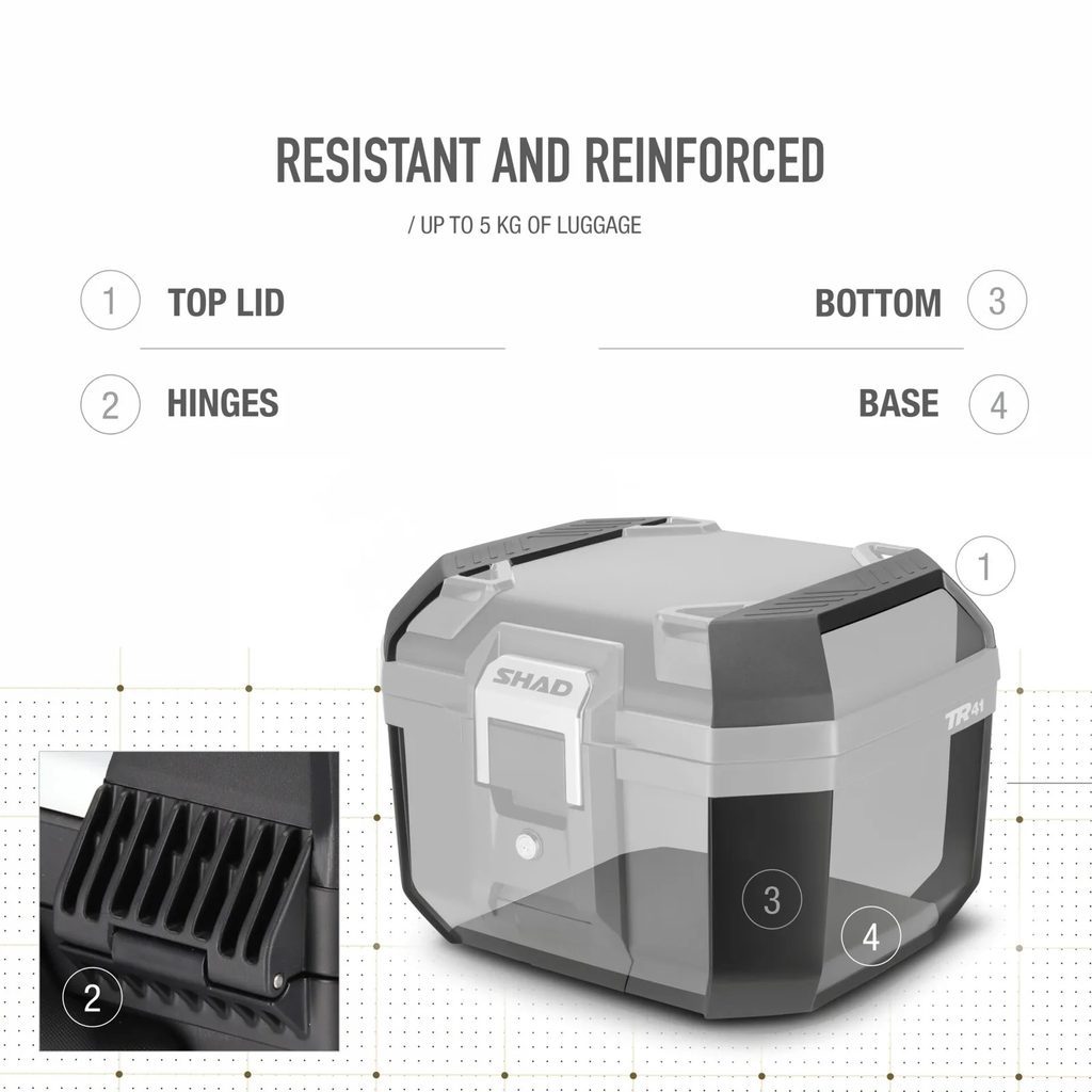 Topcase TERRA TR41 pojme dvě otevřené přilby typu JET nebo náklad do 5 kg. Je vyroben z vyztuženého polypropylenu, který zajišťuje vysokou odolnost při minimální hmotnosti. Plně navržen v Barceloně, má konstrukci vytvořenou pro maximální odolnost i v náročných podmínkách. Těsnící rám chrání obsah proti dešti a prachu. Nahoře najdete háčky pro připevnění dalšího nákladu a robustní nerezový zámek pro maximální bezpečnost. TR41 je všestranný kufr vhodný pro silniční i terénní použití.