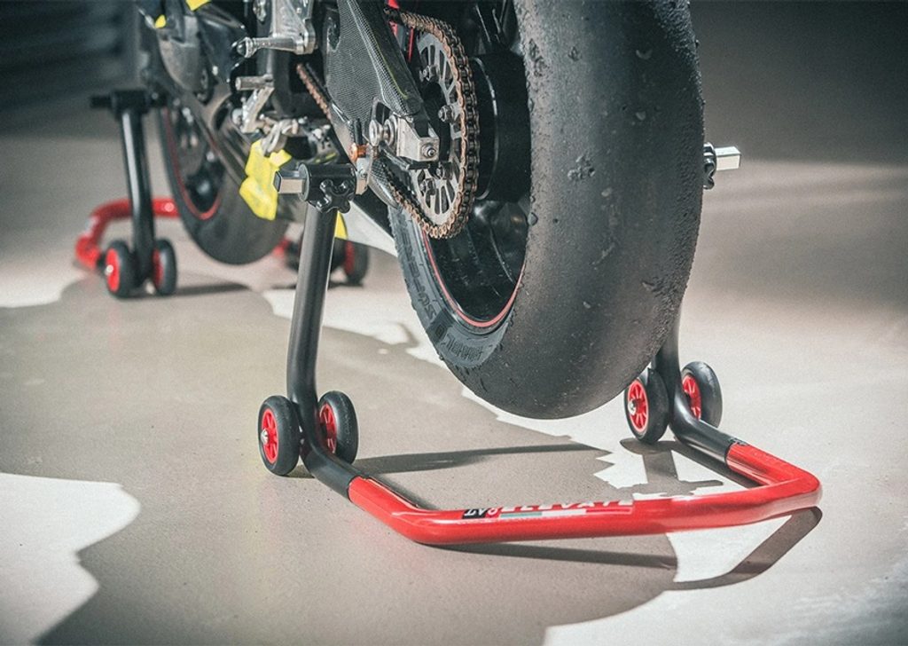 Patentovaný zadní stojan na motorku dodávaný ve třech snadno montovatelných dílech - lze ho sestavit bez použití šroubů a šroubováků.