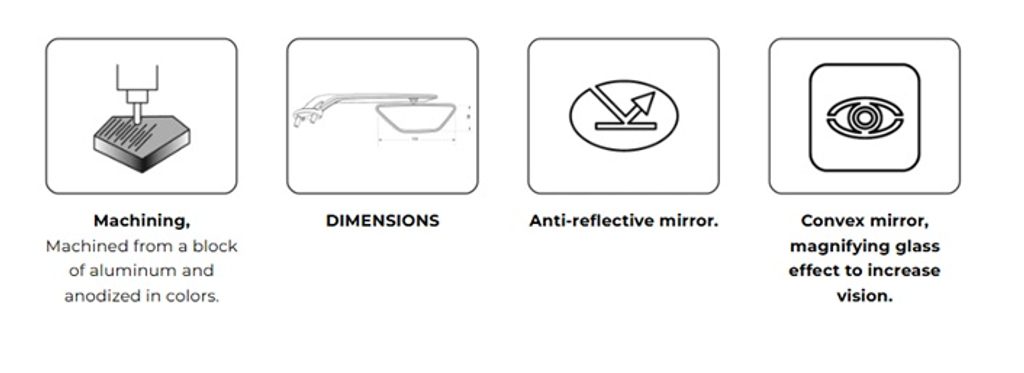 Zrcátko je dokonale integrováno do spodního konce spoileru, aby nabízelo co nejmenší aerodynamický odpor. Montáž zrcátka je ručně nastavitelná, takže se snadno přizpůsobí potřebám každého jezdce.